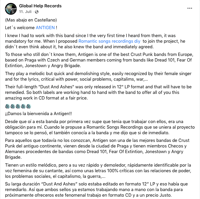 Huge THANX to Global Help Records and Romantic songs recordings diy for this great opportunity!!! Our latest album „Dust & Ashes“ will be released as a CD for those people who don’t own a record player.